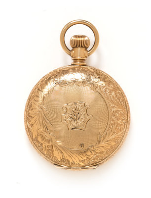 41.00 mm case dimensions, white single-sunk dial signed A.W.W. Co. WALTHAM, Roman numerals, blued steel spade hands, subdial for seconds at 6 o'clock, polished cuvette, engine turned engraved case with outer floral motif design, stem wound and set 7 jewel gilt movement signed AMERICAN WALTHAM WATCH Co.Movement number: 5028449.Case number: 407971.