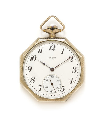 42.00 mm case diameter, white single-sunk dial signed Elgin, Arabic numerals, blued steel spade hands, subdial for seconds at 6'clock, polished octagonal case with blank cuvette, stem wound and set 19 jewel nickel movement with 5 adjustments, gold setting screws, gold center wheel and damaskeen finish signed R.W. Raymond Elgin IL.