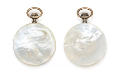 each having a 51.00 mm case diameter, white dial, Arabic numerals with gold dot outer chapter ring, Louis XV hands, stem wound and set movement, solid mother-of-pearl case back.