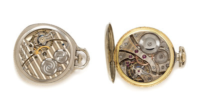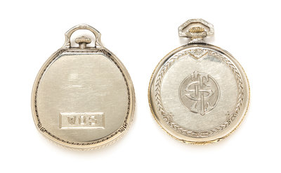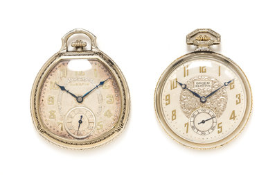 consisting of a semi-thin pocket watch, circa 1904-1917, 42.00 mm case diameter, matte white single-sunk dial with foliate engraved center signed GRUEN SEMITHIN, applied gold Arabic numerals, blued steep moon hands, subdial for seconds at 6 o'clock, engraved case back outer edge with monogrammed center, stem wound and set Cal. 758 16 jewel nickel movement with 2 adjustments signed GRUEN GUILD, together with a pocket watch, circa 1929, 44.00 mm case diameter, matte silver single-sunk dial with polished foliate motif inner ring signed HAMILTON, Arabic numerals, blued steel lozenge hands, subdial for seconds at 6 o'clock, triangular case, polished case back with monogrammed cartouche, stem wound and set 17 jewel adjusted nickel movement with damaskeen finish signed HAMILTON WATCH CO.Movement number: 17794.Movement number: 3417000.