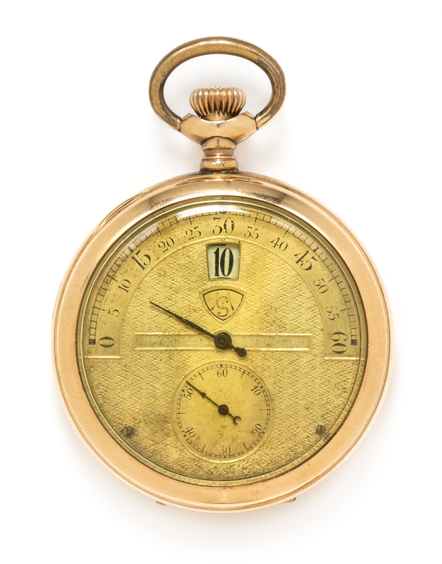 48.00 mm case diameter, engine turned silvered dial with MS monogram, Arabic numerals, steel hands, minute arch between 9 and 3 o'clock, jump hour aperture at 12 o'clock, subdial for seconds at 6 o'clock, cuvette engraved MODERNISTA PATENT, manual wind and stem set movement.Movement number: 27838.