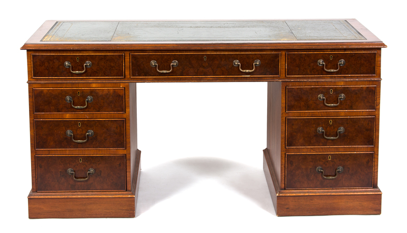 having burlwood fronted drawers and green inset leather writing surface.