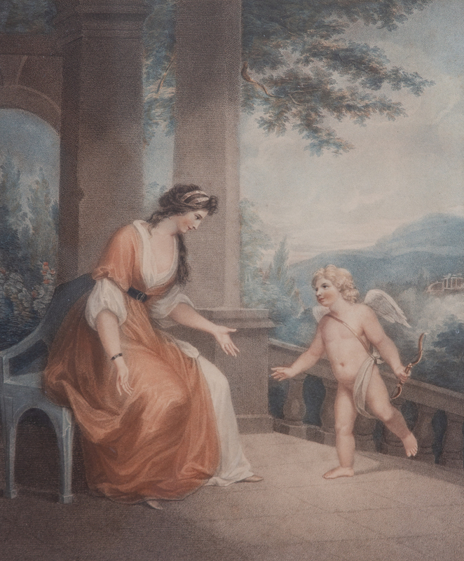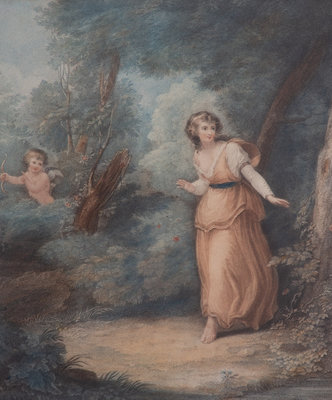depicting a maiden in forest setting being pursued by Cupid, and a seated maiden on logia with Cupid.