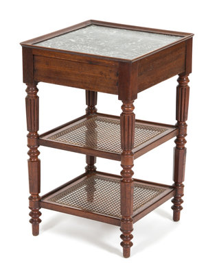 having a black inset marble top over an apron drawer, over two caned shelves.
