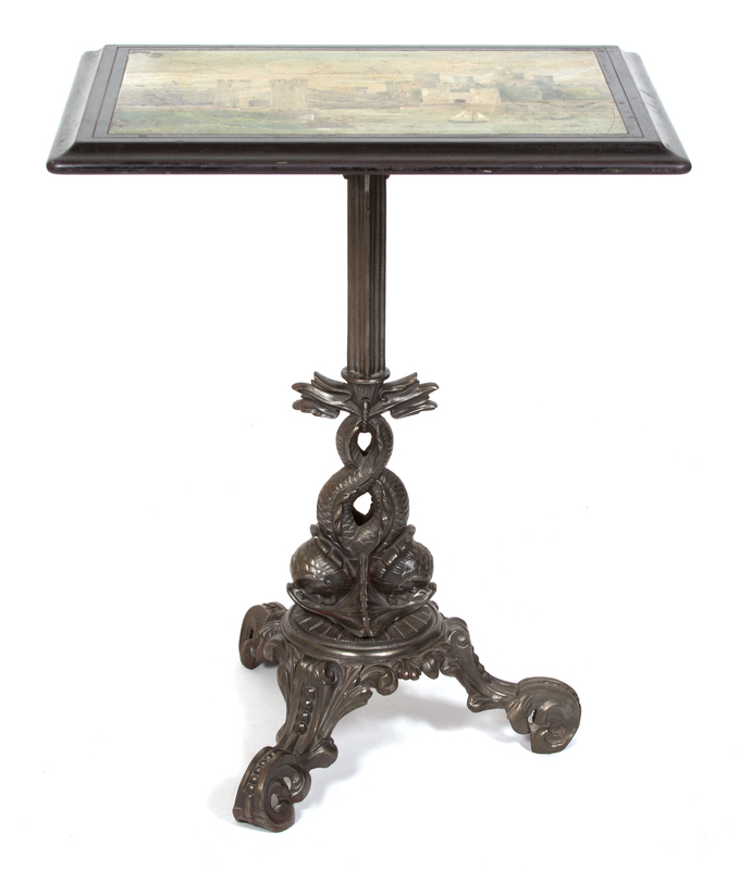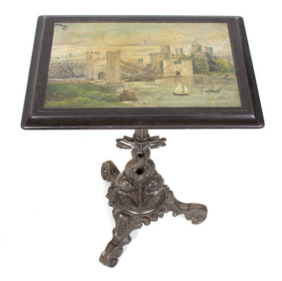 the rectangular table painted with a castle and bridge landscape, on an ebonized steel base with dolphin mounted columnar supports.