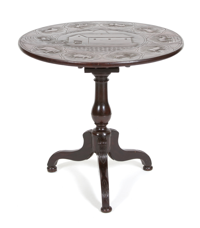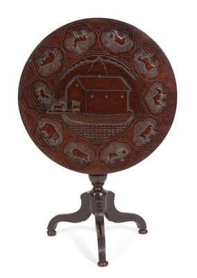 the circular top carved with a scene of the Ark with cartouches of animals, raised on a turned baluster standard ending in three scrolled legs.