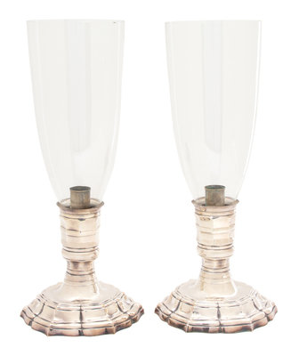 A Pair of English Silver Plate and Glass Hurricane Shades