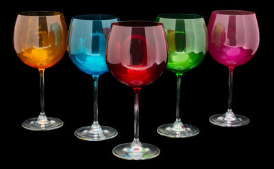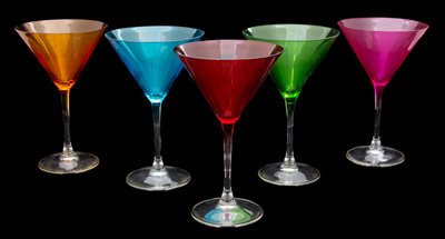 each with clear stems, comprising:4 pink wines4 orange wines4 red wines4 green wines4 blue winesand 5 martini glasses in pink, orange, red, green and blue;25 pieces total.