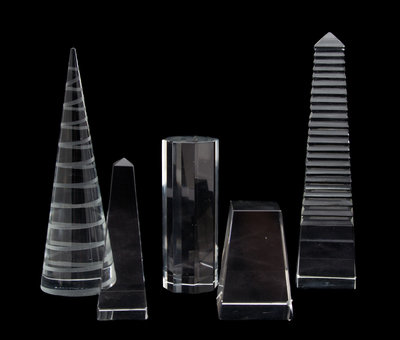 comprising a Tiffany obelisk, octagonal plinth and spiral etched cone, together with a two-part unsigned obelisk.