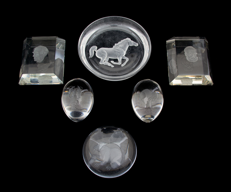 comprising two rectangular paperweights with Alexander Graham Bell and Thomas A. Edition portraits, two egg-form with astrological symbols, and squirrel, together with a shallow dish with galloping horse.