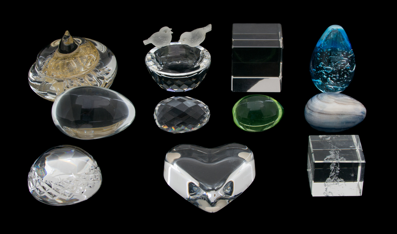 comprising five egg shape weights, two cubes, a heart, a dome and a snail form, together with a Swarovski bowl with two birds.