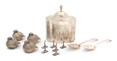 comprising a silver plate tea caddy, four bird-form salt and pepper shakers, six Portuguese dolphin-form place card holders and a pair of English silver berry spoons circa 1828.