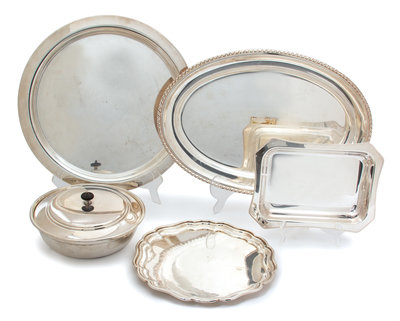 comprising three serving trays, a covered vegetable dish and a rectangular serving bowl.