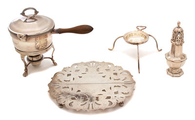 comprising a covered sauce boat on burner stand, a muffineer, a strainer on stand and a trivet.