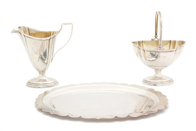 together with a silver scalloped rim circular tray