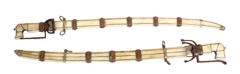 having bone inlaid, metal and coral stone mounted sheathes, steel blades.