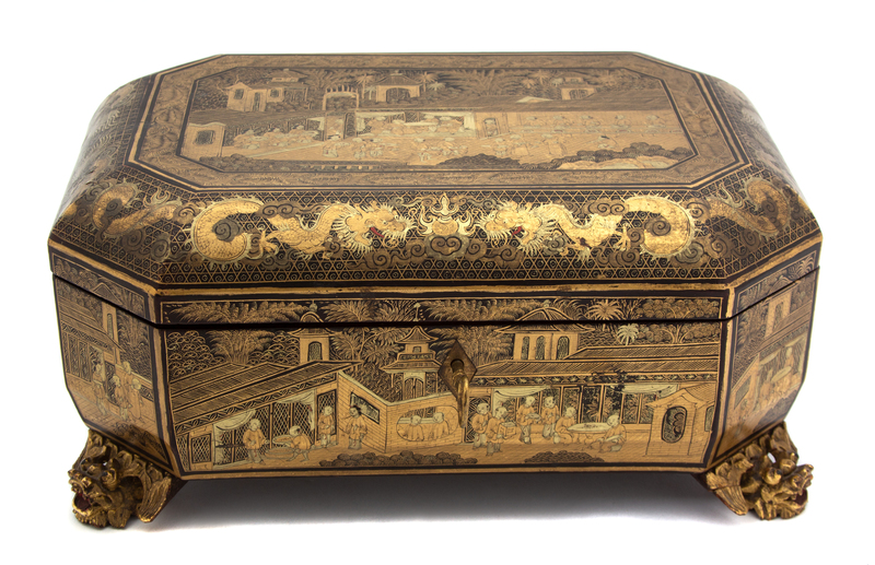 mounted on lion-form feet, with overall chinoiserie decoration.