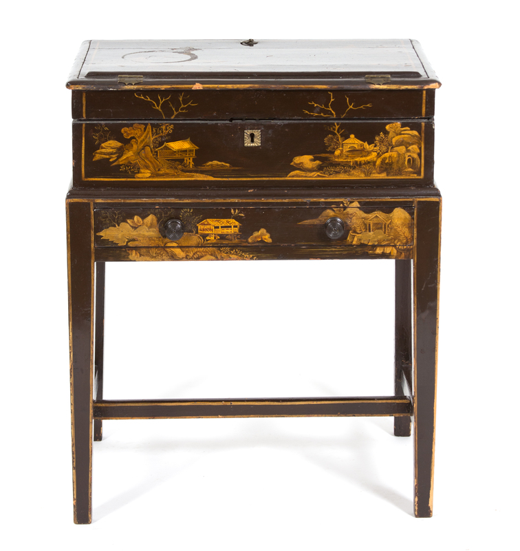 the upper case having a lid that lifts to an angled writing surface, with a side drawer.