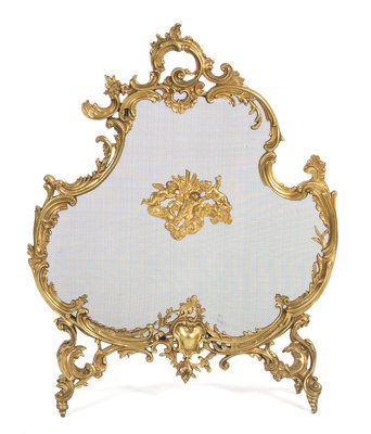 A Louis XV Style Gilt Bronze and Wire Mesh Cartouche-Form Fire Screen