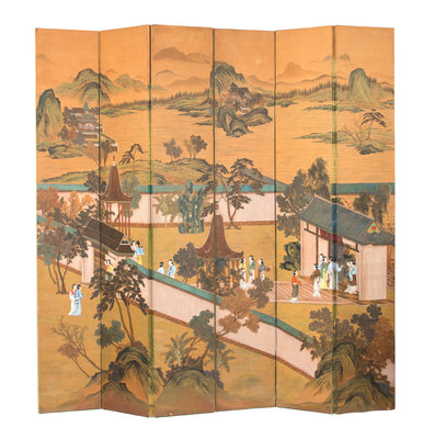 watercolor on paper, depicting floating scenes of figures in garden settings.