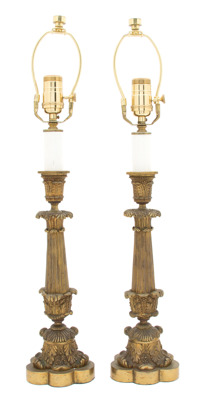 A Pair of Louis XV Style Patinated Gilt Bronze Candlesticks