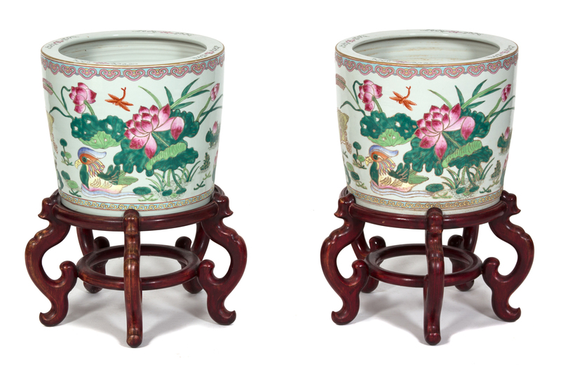 of barrel-form, depicting blossoming lotus flowers, on rosewood stands.