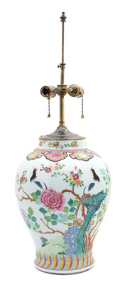 having exotic bird and peony decoration; now mounted as a lamp.