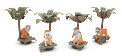 A Group of Four Painted Tole and Ceramic Palm Tree-Form Candlesticks