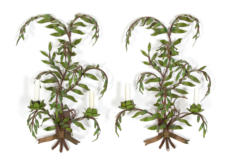 A Pair of Painted Tole Palm-Form Two-Light Wall Sconces