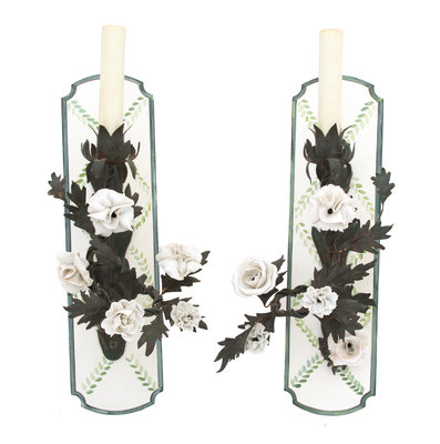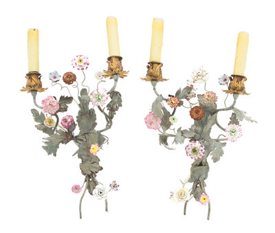 Two Pairs of Gilt Metal and Porcelain Flower Mounted Wall Sconces