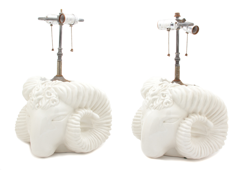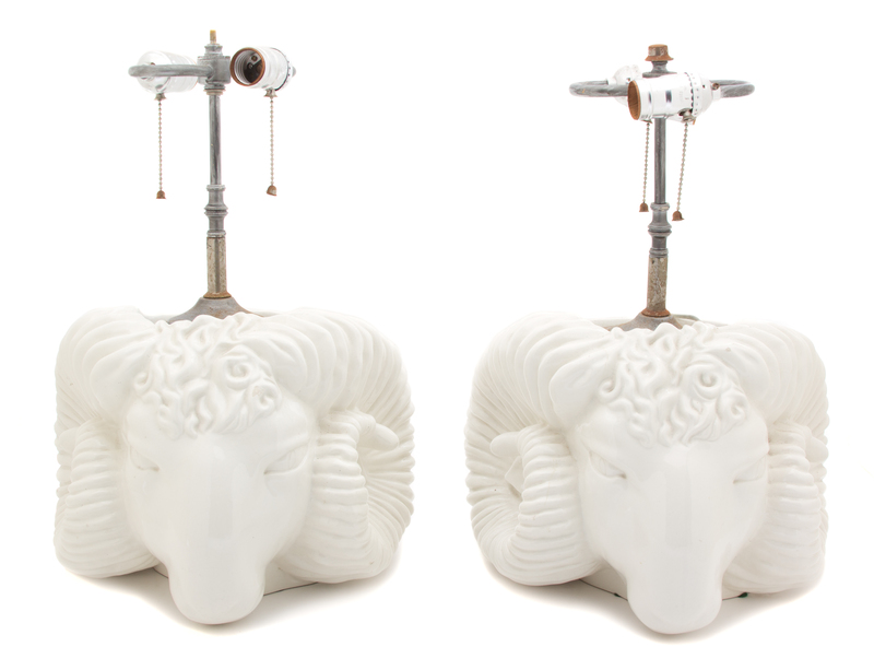 A Pair of Rams Head-Form Painted Ceramic Table Lamps