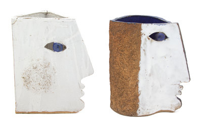 A Pair of Glazed and Painted Ceramic Face-Form Candleholder