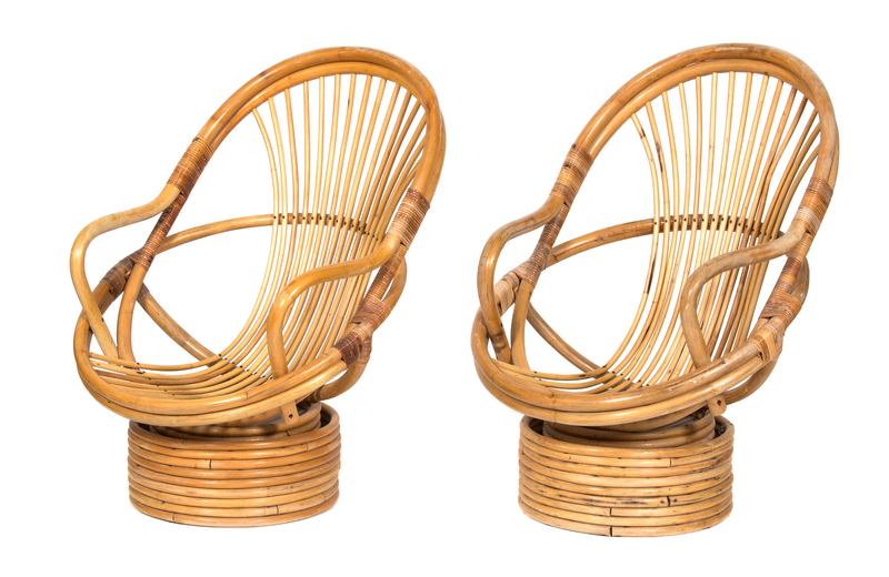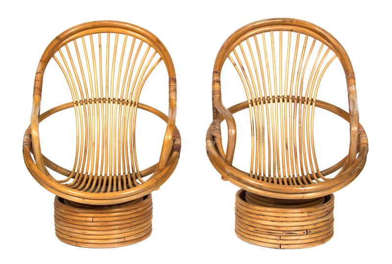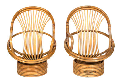 A Pair of Barrel-Back Rattan Armchairs on Swivel Bases