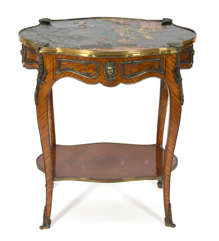 having an inset Chinoiserie decoration lacquer top, one frieze drawer, cabriole legs joined by stretcher shelf.