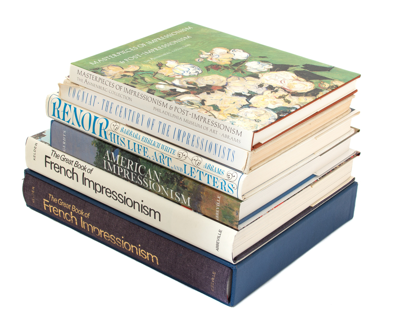 The Great Book of French Impressionism, by Diane Kelder, Autographed copy in handmade slipcase, 206/2000, Abbeville Press; a second copy, not autographed or numbered; American Impressionism, by William Gerdts, Abbeville Press, NY; Renoir: His Life, Art and Letters, by Barbara Ehrlich White, Abrams, NY; Masterpieces of Impressionism & Post-Impressionism: The Annenberg Collection, by Colin B. Bailey, Abrams, NY.; and The Century of the Impressionists, by Raymond Cogniat, Crown Publishers, NY. (6)