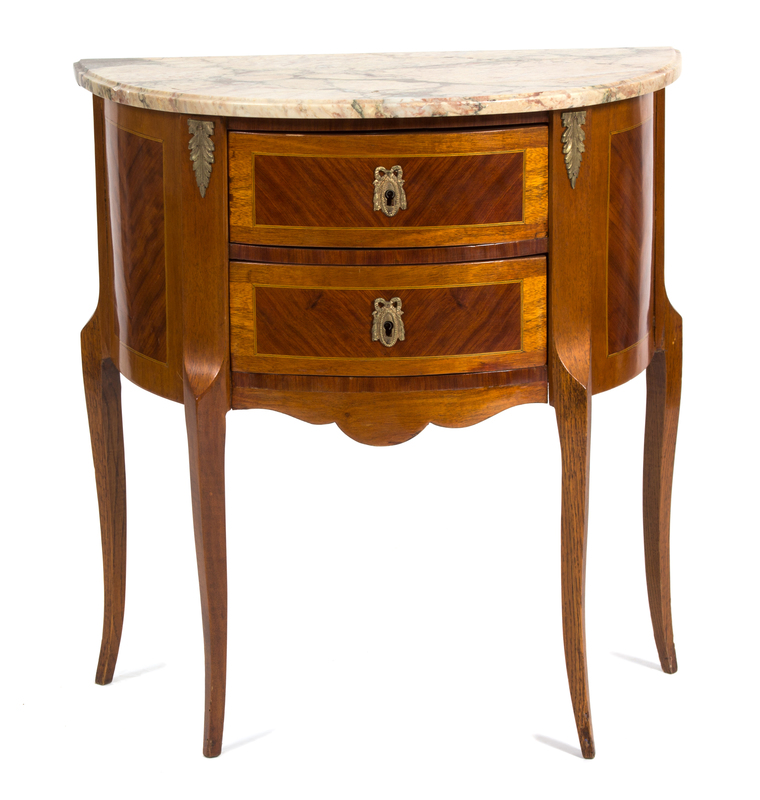 A Louis XV/XVI Transitional Inlaid Mahogany Gilt Metal Mounted Demilune Side Cabinet