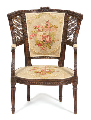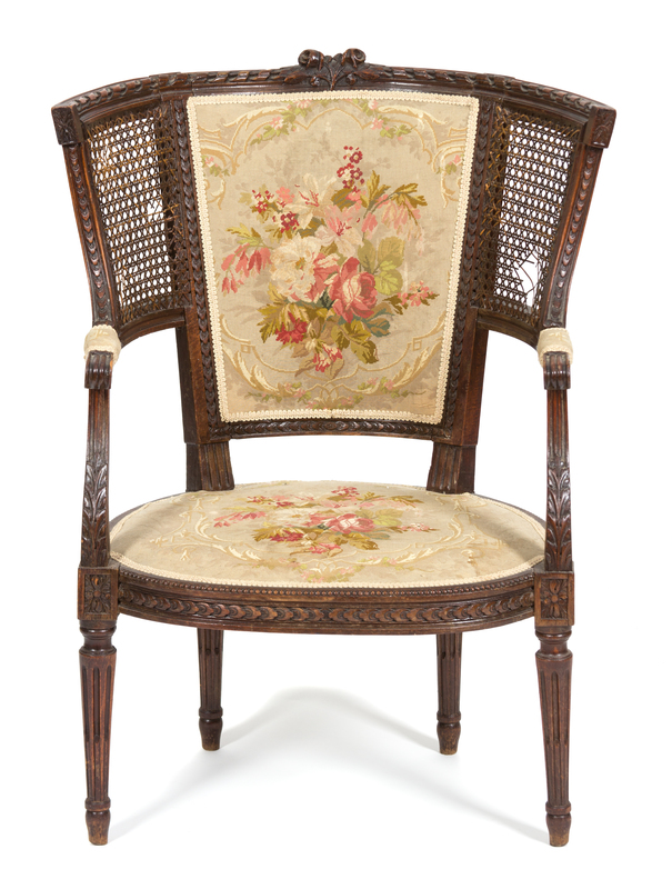 having two caned panel back with central Aubusson style uphosltered panel and seat.