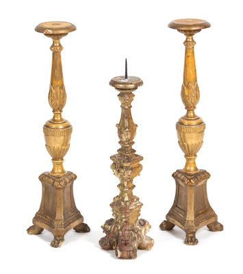 A Group of Three Italian Rococo Style Carved Giltwood Pricket Candlesticks