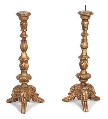A Pair of Italian Rococo Style Carved Giltwood Pricket Candlesticks