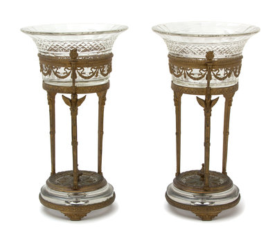 A Pair of French Empire Style Gilt Bronze and Colorless Glass Compotes