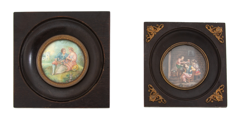 Two French Miniatures in Gilt Metal Mounted Ebonized Wood Frames