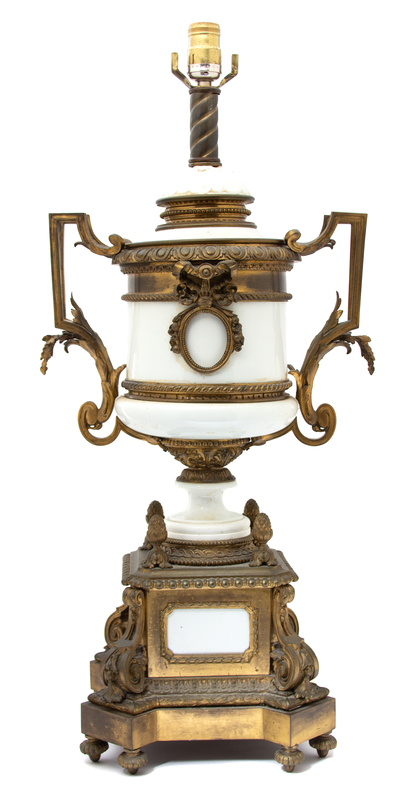 A Louis XVI Style Gilt Bronze Mounted White Ceramic Urn-formLamp