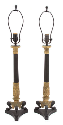 A Pair of French Empire Style Patinated and Gilt Bronze Columnar Table Lamps
