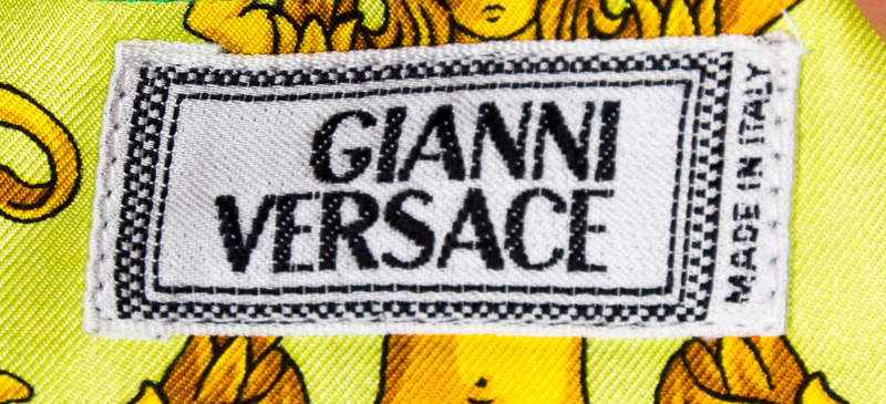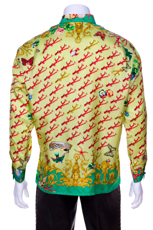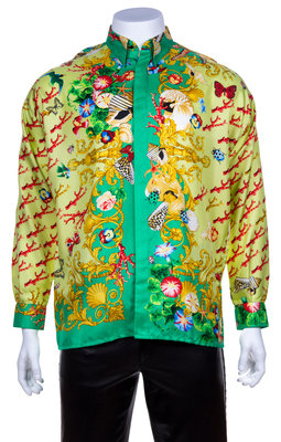 Spring/Summer 1995,with a coral and shell print, decorative black faceted buttons at the top neck closure and cuffs and right side hidden button closure.Labeled: Gianni Versace.