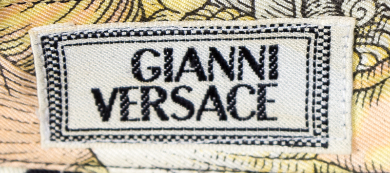 1990s,with a mask and shell print, a decorative black faceted button at the top neck closure, black and goldtone decorative buttons at the cuffs and right side hidden button closure.Labeled: Gianni Versace.
