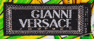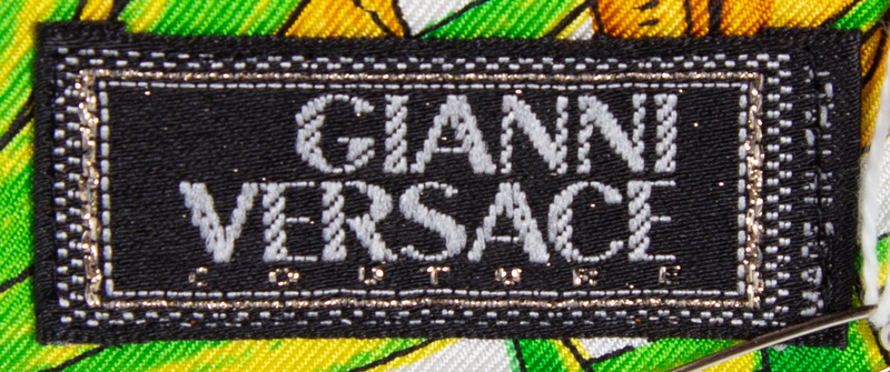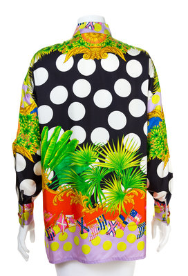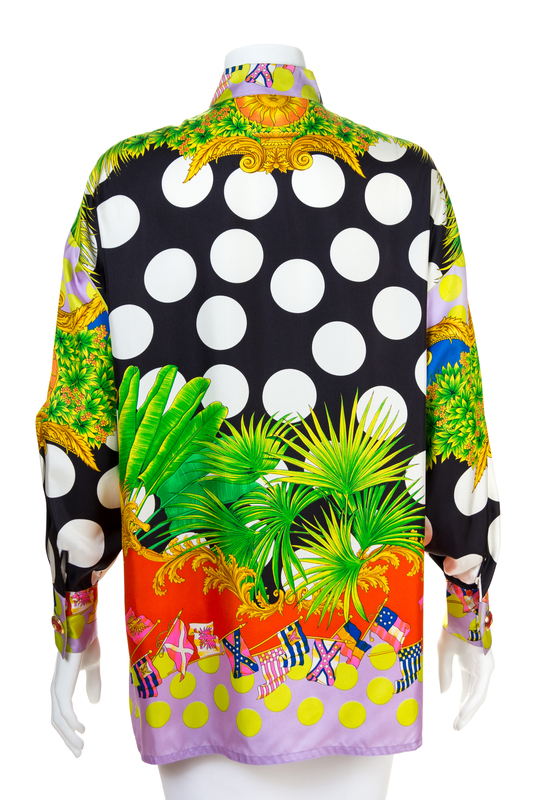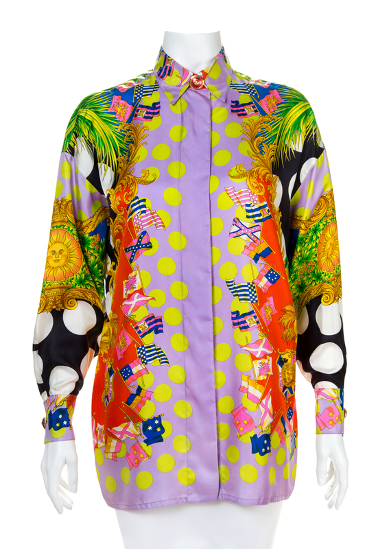 Spring/Summer 1993,"Flags" print with a goldtone and pink Medusa embossed button at the top neck closure and decorative mismatched buttons at the cuffs and left side hidden button front closure.Design featured in the Spring 1993 ad campaign and on the Spring 1993 Milan runway.Labeled: Gianni Versace Couture.