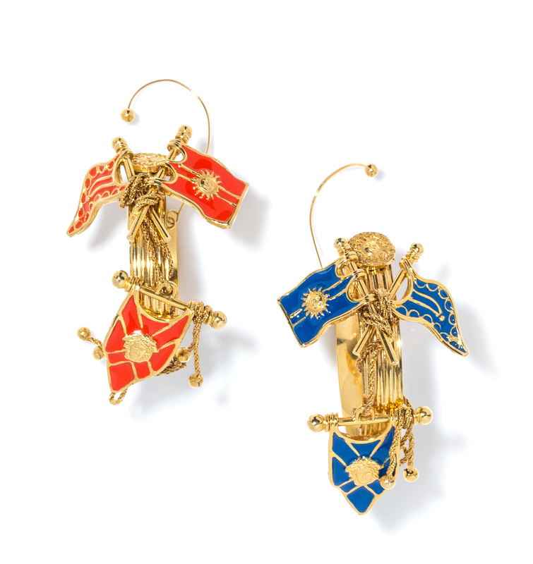 Autumn/Winter 1992-1993,goldtone, one with orange flags and one with blue flags and with wire ear wraps to help secure in place.Design featured in the Fall 1992 ad campaign.Unstamped and attributed to: Gianni Versace.