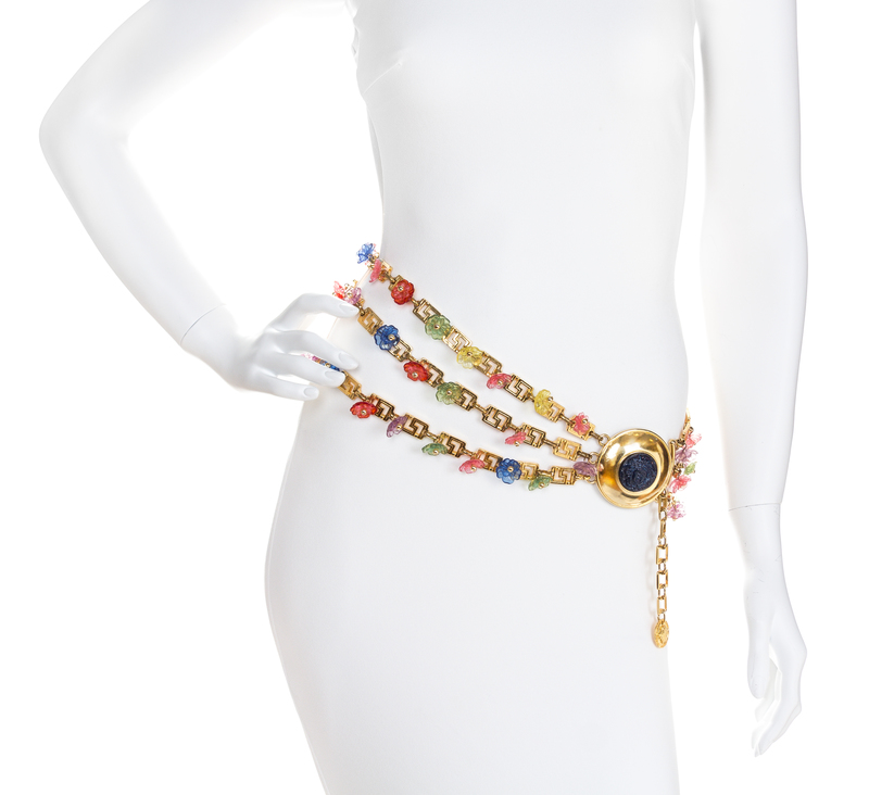 A Gianni Versace Multicolor Floral and Greco Link Triple Strand Belt,