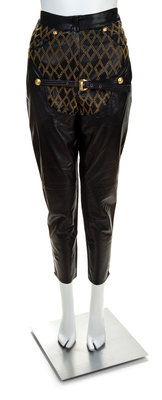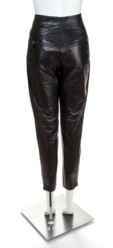 Autumn/Winter 1992-1993,with goldtone hardware, a decorative grommet embellished diamond pattern on the front, front zip closure and half belt and back zip pockets.Design featured in the Fall 1992 ad campaign.Unlabeled and attributed to: Gianni Versace.