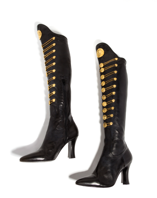 Autumn/Winter 1993-94,knee high with decorative goldtone Medusa and chain embellishment and side half zip closure.Design featured on the Fall 1993 Milan runway and ad campaign.Stamped: Gianni Versace.